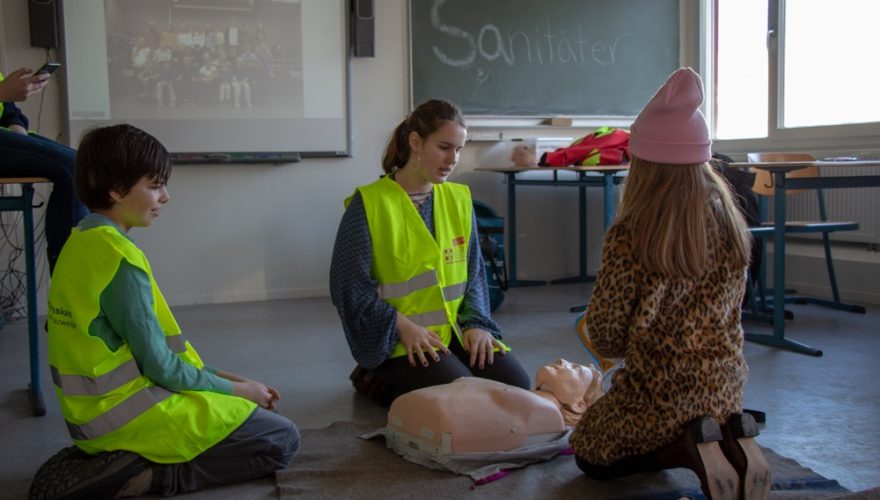 Seit 2018 gibt es am Wilhelm-Gymnasium den Schulsanitätsdienst in Zusammenarbeit mit dem Arbeiter-Samariter-Bund, der die Schülerinnen und Schüler aus- und fortbildet. Hier stellen drei Schulsanitäterinnen ihre Arbeit vor: